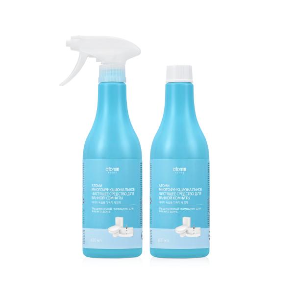 Атоми Многофункциональное чистящее средство для ванной комнаты — эффективно удаляет известковый налёт, мыльные разводы и плесень. В комплект входят 2 сменные ёмкости с концентратом и распылитель. Экономичный расход — одной ёмкости хватает на 2–3 месяца регулярного использования.